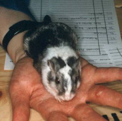 Dark Patched PiedSome Pied or Variegated gerbils in the United Kingdom have started to show distinctive dark patches. These are most easily observed on Lilac gerbils although I have seen them on Doves, Blacks and Argentes. They appear as patches, usually one, usually round and displaced slightly from the midline of the back or belly. This appears to be an area where the coat has not been diluted by the the genes causing pieing. For example a Variegated Lilac will often look more Dove than Lilac. The dark patch will therefore appear as a clear dark Lilac mark without any sign of dilution. I call these gerbils Dark Patched Pied (DPP). I have heard some people call these Tri-Colours. A tri-coloured animal is much prized because they are rare but attractive. For example, the search for a tri-coloured mouse went on for decades. However, these are not tri-colours because the base colour is always the same as the dark patches. It is only the intensity of colour that changes. An example of what is really meant by a tri-colour would be an animal with patches of white, black and gold. Clearly, that is something we in the gerbil world have to look forward to! Recently we have come across a pied Dove with clear, asymetrical, dark patches. MottledSome gerbils also extensively marked that about 50% of the upper surface is white marked. Due to variations in the coat, in particular in the number of white hairs in the dark portions of the coat, the coat appears to be a mix of different shades of the basic colour. Rogue SpotsNormally spotted, patched, pied or mottled animals carry the spotting gene. This is dominant so all white marked animals normally have at least one white marked parent. Sometimes small white marks can appear following injuries and are an artifact of scaring. However, at least one gerbil has been born with a thin irregular white stripe on its face that does not appear to be due to the spotting gene or to scaring. This gene tends to lead to substantial amoiunts of white onthe feet, even when the spots o nthe head etc are very small. This gerbil, illustrated below, has no white on the feet at all and both parents were not white spotted. Can you explain all that again?No! But this final picture of a Patched and a Pied gerbil side by side should help.